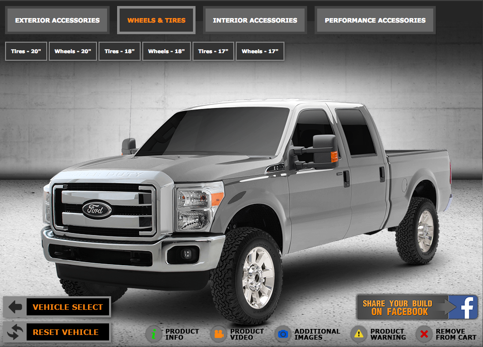 As you will see once you launch our main demo or your Interactive Garage Software program there is a new top line category of “Wheels & Tires”. We had to do this with this particular category as the options for 17″, 18″ and 20″ wheels & tires are massive in their own rights. All other vehicles other than the F250 currently have the 17″ wheel & tire offering currently, but we will be working hard to get them all updated as soon as possible so this category on your Interactive Garage Software program is up to our standards across the board.
