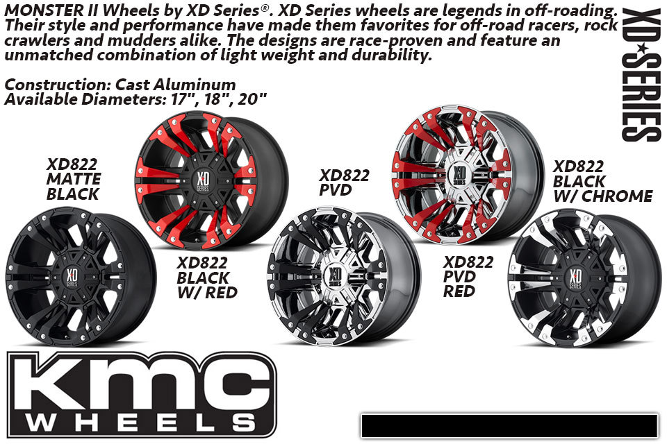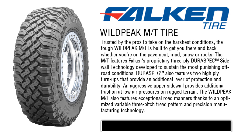 Wheels from Fuel, KMC, SOTA Offroad, Pro Comp, ATX and Method. Tires from BFG, Goodyear, Toyo, Pro Comp, and the new Falken Wildpeak M/T.